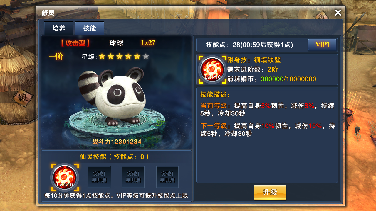 3.技能升级:按照在线时长获得技能点升级,当然也需要一些铜币啦。