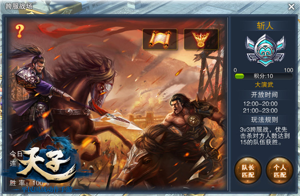 每位达到50级的将士们,均可在试炼界面开启全新旅程—跨服战场。将士们可进行个人匹配,也可邀请好友一起进行3V3激战。在耸入云霄的高空之上,遗留着一座仙家遗迹,是远古仙魔大战千百年后保存下来的征战沙场。对战的将士们将在此具体盛大的演武之战,谁将胜出,创造新一代的传奇与神话,让我们拭目以待。