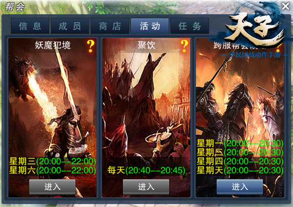 本次公会系统的大升级也是众多进化中不可或缺的一部分,《天子》手游新版新增的“跨服帮会战”就为帮会的勇士们带来了一场全新的帮会征战,每个帮会成员均可点击帮会界面在活动中参加跨服帮会战场,并在界面中查看相关的信息。激情的帮会战即可就可以进行啦~更多精彩,请期待《天子》新版“群雄逐鹿”!