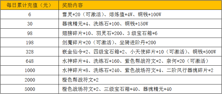 1、活动期间,单日累计充值满对应金额即可领取对应奖励,每档奖励每天均可参加1次;