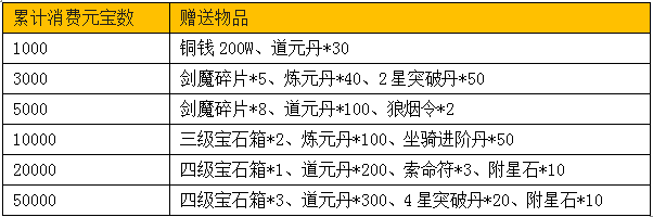 活动内容:迎江山美人新版本活动期间内,游戏内累积消耗达到一定数量的元宝,即可在游戏内“活动”面板中领取大量剑魔碎片、三级宝石箱、四级宝石箱、附星石、坐骑进阶丹、炼元丹、海量道元丹等超豪华礼品。