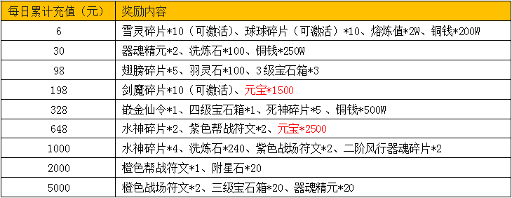 活 动内容:活动期间,将士们每日累计充值达到指定金额,即可在活动面板领取豪华酷炫礼品,更可领取海量元宝福利,冰封千丈水神、万剑齐发剑魔、铜墙铁壁球 球、灵之冰爆雪灵、二阶风行器魂碎片、橙色战场符文、橙色帮战符文、紫色战场符文、嵌金仙令、器魂精元、四级宝石箱、附星石、洗炼石等酷炫礼品应有尽有, 超值精彩不容错过。