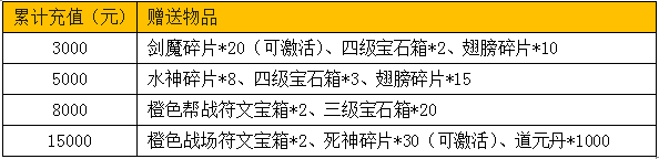 活动内容:迎江山美人新版本活动期间,凡累计充值满对应额度,即可在活动面板领取超稀有限时仙灵死神、海量四级宝石箱、海量剑魔碎片与水神碎片,升星之路一马平川,更可领取超稀有橙色帮战符文宝箱、橙色战场符文宝箱、海量道元丹与翅膀碎片,为展翅翱翔增添强大动力。