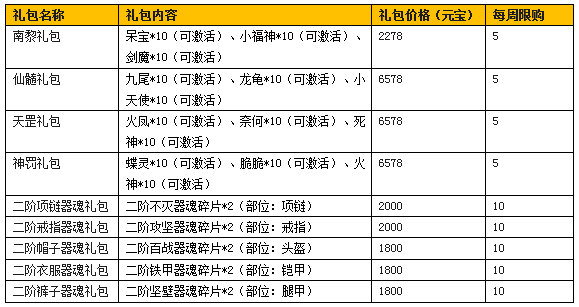 活动内容:活动期间内,将士们登录游戏即可在游戏“商城”面板购买南黎礼包、仙髓礼包、天罡礼包、神罚礼包、二阶项链器魂礼包、二阶戒指器魂礼包、二阶帽子器魂礼包、二阶衣服器魂礼包、二阶裤子器魂礼包,礼包内容包括万剑齐发剑魔、千钧一发小天使、鬼影重重死神、炎火乱舞火神等四仙阵仙灵,二阶不灭器魂、二阶攻坚器魂、二阶百战器魂、二阶铁甲器魂、二阶坚壁器魂共五个顶级二阶器魂,限时福利,超值优惠,将士们千万不要错过哦~