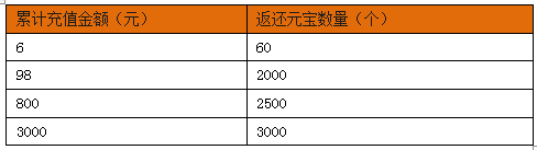 2、累计充值可进行累加,充值金额叠加,累计充值3000元,可领取本次活动的全部元宝奖励。例如:累计充值98元总共可领取的活动奖励元宝=累计充值98元活动奖励2000元宝+累计充值6元活动奖励60元宝。