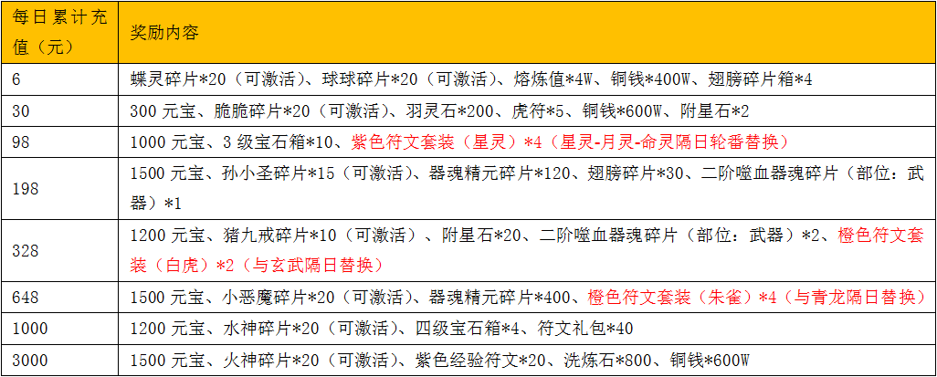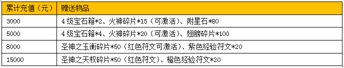活动内容:活动期间,凡累计充值满对应额度,即可在活动面板领取双倍豪华福利。圣神之玉衡红色符文、圣神之天权红色符文、超稀有仙灵火神、紫色经验符文、橙色经验符文和四级宝石箱,战力提升犹如神助,将士们快来参加吧!