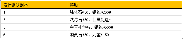 活动内容:活动期间,将士们累计参加组队副本达到指定次数,即可在活动面板获得海量好礼福利。仙灵礼包、强化石、洗炼石、金玉礼包、海量羽灵石、海量元宝酷炫奖励。战鼓已擂响,号角已吹起,将士们赶快出击展现自己的傲世之才吧!