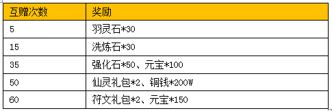 活动内容:活动期间内,将士们累计赠送伙伴礼物达到一定次数,即可在活动面板领取好礼福利。海量羽灵石、大量洗炼石、大量仙灵礼包、符文礼包、海量元宝等实惠奖励,赶紧为自己的伙伴奉上自己的新版本祝福吧~