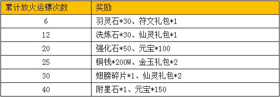 活动内容:暴君临世活动期间内,将士们累计放火运镖达到一定次数,即可在活动面板领取海量元宝、仙灵礼包、金玉礼包、羽灵石、大量洗炼石等超值优惠福利,赶紧参加放火运镖任务,赢取海量实惠礼品吧~