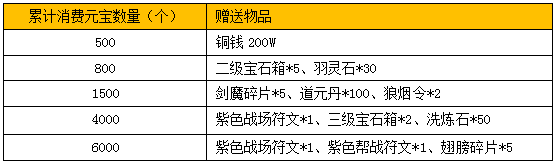 活动内容:活动期间内,游戏内累积消耗达到一定数量的元宝,即可在游戏内“活动”面板中领取极品仙灵剑魔、紫色战场符文、紫色帮战符文、三级宝石箱等海量福利等你来领取,千万不要错过~