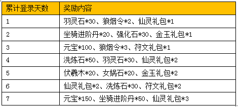 活动内容:活动时间内,只需累计登录相应天数,即可领取海量豪华登录奖励。包括海量元宝福利、仙灵礼包、坐骑进阶丹、强化石、狼烟令、符文礼包、羽灵石、伏羲木、女娲石、洗炼石等海量礼品,应有尽有,赶快通知小伙伴!错过就太可惜了!记住在活动面板领取对应奖励哦!