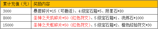 1、活动期间,多日累积充值达到对应金额即可领取对应奖励。多日累积充值满15000,即可领取全部奖励。