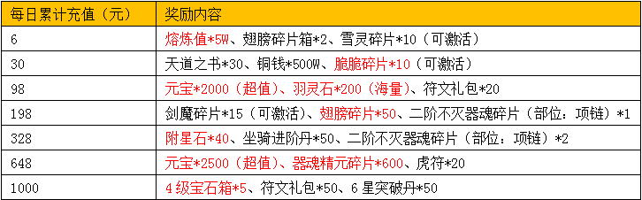 1、活动期间,单日累计充值满对应金额即可领取对应奖励,每档奖励每天均可参加1次;