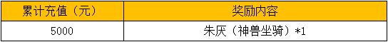 活动内容:活动期间内,将士们只需累计充值满5000元,即可在活动面板领取超稀有神兽坐骑朱厌,震天撼世神兽助战,将士雄风威猛如山~