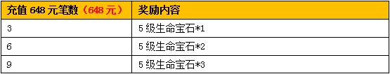 1.将士们累计充值648元笔数达到一定数量,即可获得对应档次的奖励,不可获得其他档次的笔数奖励。例如:充值648元笔数达到6笔,即可领取充值648元笔数达到6笔的奖励(5级生命宝石*2),不可领取充值648元笔数达到3笔的奖励(5级生命宝石*1)。