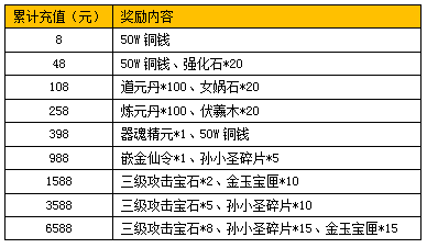 活动内容:活动期间多日累积充值达到对应额度,即可在活动面板领取超值累充大奖!