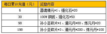 活动内容:活动期间,单日累计充值满对应金额即可领取对应奖励,每档奖励每天均可参与1次;满足条件后,请在当天及时领取“活动”面板中的奖励,逾期将无法领取。