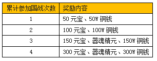 活动内容:参加国战次数,达到相应次数,即可在活动面板领取对应的奖励