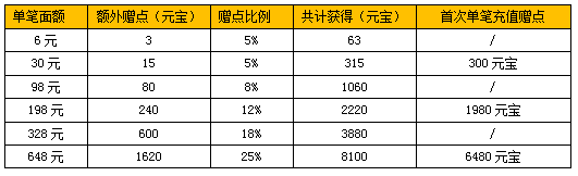 活动内容:活动期间单笔充值以下面额都将获得充值赠点,您可以点击游戏内的任意充值按钮进行查看充值。除了每笔充值都有额外赠点以外,单笔面额为30元、198元和648元的充值还将享有首次单笔充值买一赠一的福利。