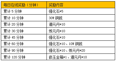 活动内容:登录游戏后,游戏角色累计在线达到一定时间后,即可在游戏内奖励面板“在线礼包”福利中领取相应的丰厚奖励。