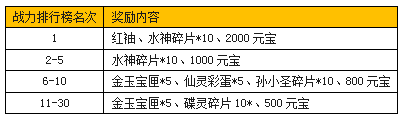 活动内容:自开服起截止11月22日21:00整,战斗力达到对应名次,即可获得对应奖励。奖励将在获奖一周时间时间内陆续发送给将士们