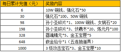 1、活动期间,单日累计充值满对应金额即可领取对应奖励,每档奖励每天均可参加1次;