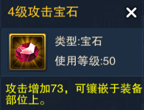 4级攻击宝石:使用等级50,可镶嵌于装备部位上,增加攻击73点。