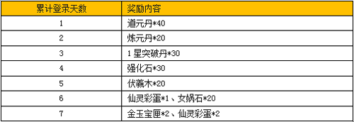 活动内容:活动时间内,只需累计登录相应天数,仙灵彩蛋、金玉宝匣、伏羲木、道元丹、炼元丹、突破丹、强化石,应有尽有,赶快通知小伙伴!错过就太可惜了!记住在活动面板领取对应奖励哦!