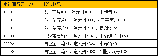 活动内容:活动期间内,游戏内累积消耗达到一定数量的元宝,即可在游戏内领取大量四级宝石箱、海量孙小圣碎片、海量道元丹、坐骑进阶丹、灵宠突破丹、狼烟令等超豪华礼品。