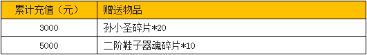 活动内容:活动期间,凡累计充值满对应额度,即可在活动面板领取大量超稀有神装二阶器魂(部位:鞋子)碎片,更有海量孙小圣碎片相赠,极品神装升阶近在眼前,仙宠升星一马平川。