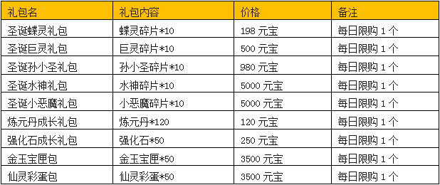 活动内容:圣诞活动期间,将士们可在游戏中“商城”面板购买限时每日成长礼包、仙灵大礼包等特享礼包。蝶灵、水神、小恶魔、巨灵、孙小圣、金玉宝匣、仙灵彩蛋等,超豪华阵容容应有尽有,限时抢购,将士们快来优惠购买吧。