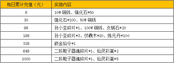 1、活动期间,单日累计充值满对应金额即可领取对应奖励,每档奖励每天均可参加1次;
