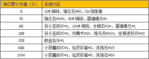 活动内容:活动期间,将士们每日累计充值达到指定金额,即可在活动面板领取海量酷炫礼品。包括极品仙灵小恶魔、大闹天宫孙小圣、海量熔炼值、器魂精元、海量洗练石、女娲石、伏羲木、嵌金仙令,应有尽有,超值精彩不容错过。