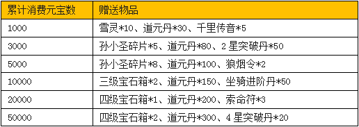 活动内容:活动期间内,游戏内累积消耗达到一定数量的元宝,即可在游戏内领取灵之冰瀑雪灵、大量四级宝石箱、海量孙小圣碎片、海量道元丹、坐骑进阶丹、灵宠突破丹、狼烟令等超豪华礼品。