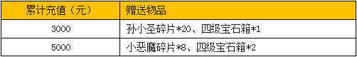 活动内容:活动期间,凡累计充值满对应金额,即可在活动面板领取海量孙小圣碎片、大量极品仙灵小恶魔碎片,孙小圣升星一马平川,极品仙灵小恶魔唾手可得,更有稀有四级宝石箱相赠,豪华优惠,限时参加不容错过。