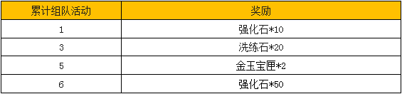 活动内容:活动期间内,将士们累计参加组队活动达到一定次数,即可在活动面板领取海量强化石、大量洗练石、大量金玉宝匣实惠奖励,战鼓擂擂号角争鸣,将士们快来参加吧~