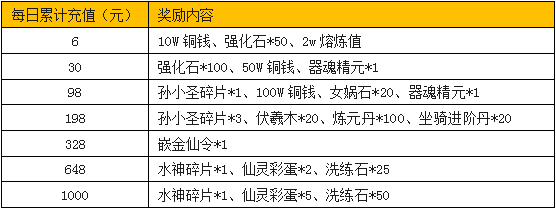 活动内容:活动期间,将士们每日累计充值达到指定金额,即可在活动面板领取海量酷炫礼品。包括极品仙灵水神、大闹天宫孙小圣、海量熔炼值、器魂精元、海量洗练石、女娲石、伏羲木、嵌金仙令,应有尽有,超值精彩不容错过。