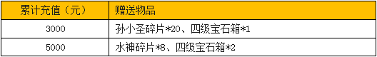活动内容:活动期间,凡累计充值满对应金额,即可在活动面板领取海量孙小圣碎片、大量极品仙灵水神碎片,孙小圣升星一马平川,极品仙灵水神唾手可得,更有稀有四级宝石箱相赠,豪华优惠,限时参加不容错过。