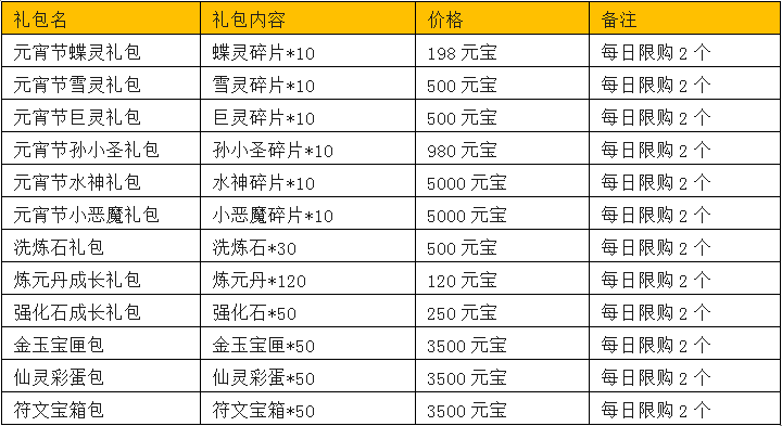 活动内容:元宵节活动期间,将士们可在游戏中“商城”面板购买限时每日成长礼包、仙灵大礼包等特享礼包,每日均可购买两次哦。水神、小恶魔、巨灵、孙小圣、蝶灵、金玉宝匣、仙灵彩蛋、符文宝箱、洗练石等,超豪华阵容应有尽有,限时抢购,将士们快来优惠购买吧。
