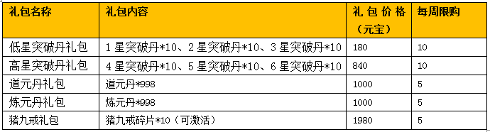 活动内容:九戒降临迎王者,礼包连连送祝福。在迎王者降临新版本活动期间,我们特地为将士们在“商城”准备了丰厚的礼包,包括天蓬降临猪九戒、道元丹、炼元丹、海量星级突破丹豪华礼品应有尽有,超值优惠,限时参加,将士们快来优惠购买吧~