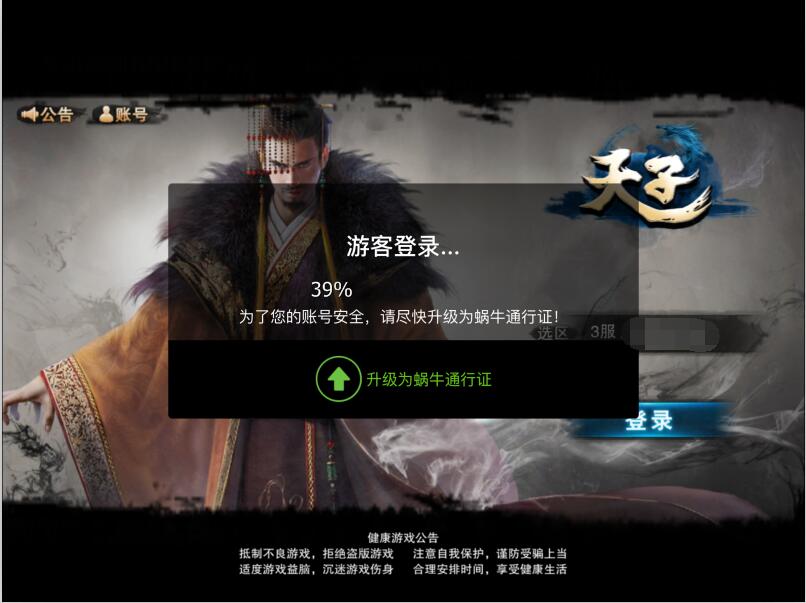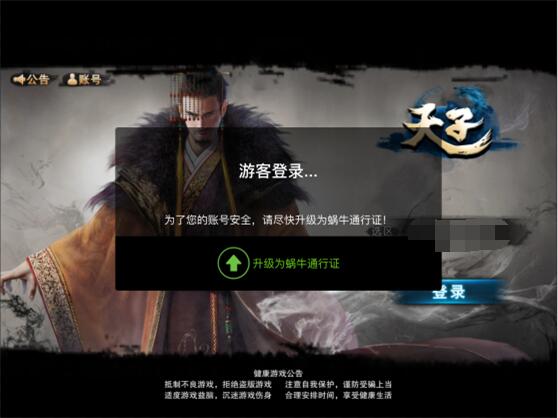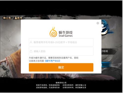 升级为蜗牛通行证:若在游客登录中,用户点击“升级为蜗牛通行证”按钮,进入蜗牛通行证填写页面,用户输入账号、密码,点击“确定”按钮。弹出实名认证页面,用户输入真实姓名、身份证号码,点击“提交”按钮。(若用户不填写实名信息,升级成功,实名失败)