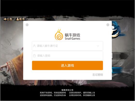 蜗牛用户登录:用户通过登录方式选择页面,点击”蜗牛用户登录“按钮,弹出登录页面。用户输入通行证、密码,点击“提交”按钮请求登录游戏。