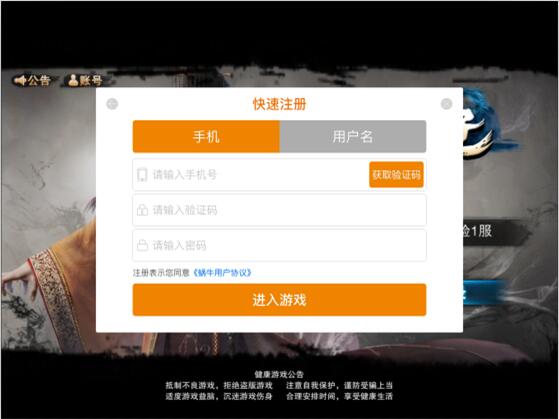 手机注册:用户输入手机号、验证码、密码,点击“进入游戏”按钮弹出实名认证页面,用户输入真实姓名、身份证号码,点击“提交”按钮。(若用户不填写实名信息,注册失败)