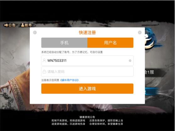 普通注册:用户选择系统分配账号或输入自行定义账号,密码 点击“进入游戏”按钮弹出实名认证页面,用户输入真实姓名、身份证号码,点击“提交”按钮。(若用户不填写实名信息,注册失败)