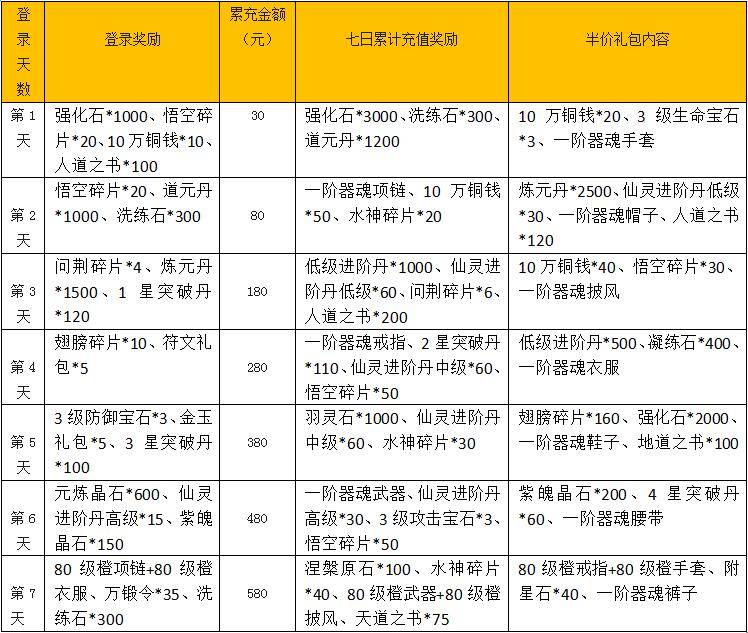 3、七日半价礼包活动周期将由玩家创建角色开始进行计算,将有30天的有效期、有效期结束后活动消失。