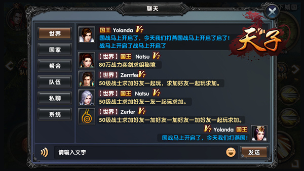 在交互系统的打造上,《天子》手游一方面沿用了端游中的聊天系统,专门开辟出“世界”、“帮会”、“私聊”等窗口,以便让玩家就游戏中的问题与大家沟通。另一方面,游戏以诸侯伐纣的故事为主线剧情,所以增加了“国家”窗口,只有同一势力的玩家才能在其中进行交流,尤其是在国战前夕,玩家可以通过国家窗口集结军队,讨论战术,刺探敌情,从而知己知彼,增加胜算。