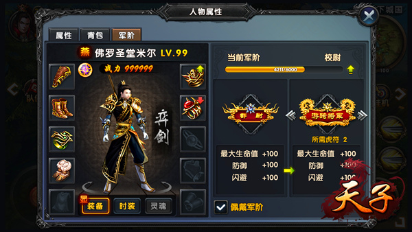 《天子》手游的核心是国战玩法,因此在提升战力上,除了通常的装备提升和等级提升外,还有一个独特的军阶系统。玩家一开始在国家军队中的职位是新兵,在后续的发展中,根据自己对国家的贡献值大小,逐步提升军衔,步卒、轻骑、校尉、都尉、偏将,一直到副将、将军等,没一次“升值”都会带来生命值、攻击力和防御力的提升。当然,提升军阶所需的虎符并不容易获得,需要玩家每天完成国家任务,为国效力,才能步步高升,登临天子之位。