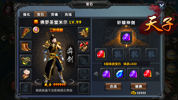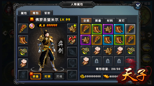 装备自然与角色的战力直接挂钩,不同品阶的装备可以为角色带来各种属性效果。《天子》手游中的装备系统非常丰富,以八荒为例,除了常见的长枪、战靴、头盔之外,还有项链、戒指、手套、披风、战袍等装备,玩家可以通过多种途径获取这些装备,并且利用金钱资源进行装备升级。在《天子》手游中,强化装备需要消耗铜币和强化石,相对来说比较简单,是提升玩家个人实力最基础的方法。