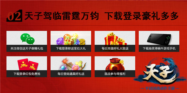 《天子》手游雷霆测试期间,线上福利大派送,十七重福利绝对可以带给你意想不到的超值惊喜,带来国战手游史上前所未有的饕餮盛宴!“七天登陆活动”可以免费领取众多元宝,还有极品紫色武器相送,让你在霸道之路上获得强大助力;七天登陆,帮会活动,战力升级等众多活动均有大量元宝、各式装备材料相送;二测充值返还、首充丰厚福利……心动不如行动,快来《天子》手游征战沙场吧!(更多福利详情详见官方公告)