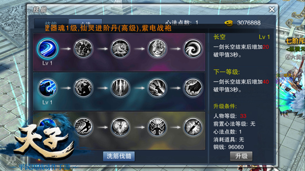 第一套心法"长空"主要在于强化招式的连击与机动性,重点强化了玩家技能“一剑长空”,增加了技能一剑长空的破甲率,后续强化则提升了技能的连招,并增加了角色的移动速度,此套心法重点在于与技能“一剑长空”的紧密搭配。